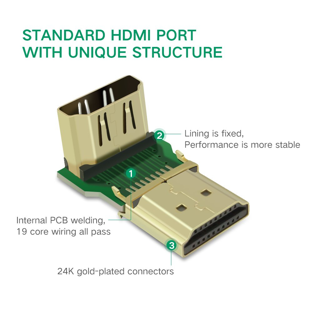 تبدیل HDMI با زاویه 90 درجه یوگرین مدل HD112-20109 از وضوح 4K الی 2K پشتیبانی می کند. بدون خطر خم شدن بیش از حد کابلهای HDMI که ممکن است به کابل یا حتی بدتر از آن به پورتهای تجهیزات گرانقیمت شما آسیب برساند، طول عمر دستگاهها و کابل HDMI را افزایش میدهد، انعطافپذیری لازم را به شما میدهد. این کانکتور 90 درجه برای هر دستگاهی که دارای پورت HDMI است کار می کند.