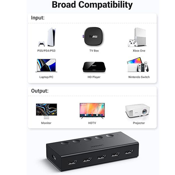 سوئیچ HDMI یوگرین 1 به 5 مدل CM568-90512 4K، برای اشتراک گذاری چند سیستم پخش کنندهی تصویر به یک نمایشگر استفاده میشود. این محصول یکی از کاربردیترین اقلامی است که امروزه با پیشرفت تکنولوژی استفاده از آن نیز به نوعی الزام تبدیل گشته است. سوئیچ HDMI یوگرین 1 به 5 مدل CM568-90512 4K، زمانی مورد استفاده قرار میگیرد که بخواهید از چند دستگاه در موقع لزوم استفاده کنید. این وسیله اتصال کننده دستگاهای پخش کننده به نمایشگر بصورت جداگانه است. بوسیله ریموت کنترل محصول و یا دکمهی تعبیه شده روی دستگاه میتوان به صورت جداگانه پورت HDMI دستگاه را سوئیچ کرد. دارای نصب آسان میباشد و بهترین گزینه برای کنفرانسها و سرگرمی است. با استفاده از سوئیچ HDMI یوگرین 1 به 5 مدل CM568-90512 4K، میتوان 5 تصویر مختلف را همزمان به یک نمایشگر به متصل کرد. این سوئیچ پشتیبانی از کیفیت تصویر 4K@60Hz را دارد و دارای درگاه برق USB-C میباشد.این محصول با انواع کنسول های بازی و ذخیره ساز های تصاویر (DVR,NVR) سازگار می باشد.