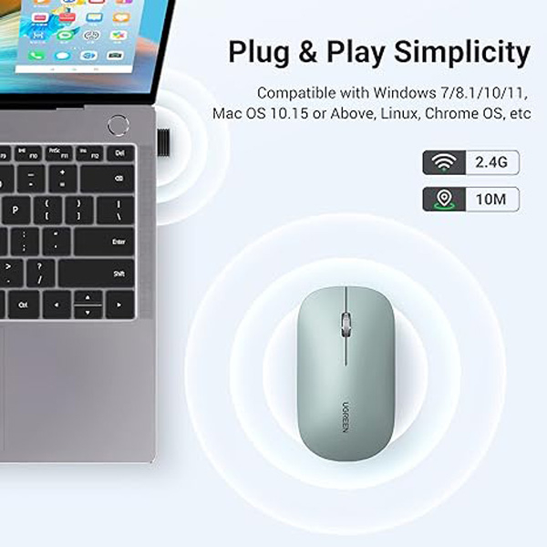 ماوس بی سیم یوگرین مدل MU001-90374 دارای طراحی مینیمال و دقت بسیار بالا برای استفاده روزانه، طراحی، بازی و لذت بردن از کار با کامپیوتر می باشد. این موس دارای قابلیت سوپر سایلنت می‌باشد، که این موس را یک انتخاب ایده‌آل برای استفاده در دفتر‌های کار مشترک، اتاق‌های کنفرانس، کتابخانه، اتاق خواب و … می‌سازد. به دلیل طراحی ساده، وزن سبک و باریک بودن آن، مناسب برای حمل و سفر می‌باشد. نحوه اتصال این موس به شکل بی سیم و با استفاده از دانگل USB 2.4GHz می باشد. دقت این موس قابلیت تنظیم در 4 حالت تا 4000DPI را دارد از این رو سرعت و دقت بالایی در رزولوشن های 8K و 4K خواهید داشت.با توجه به طراحی آن در صورت استفاده از باتری مرقوب می تواند تا 18 ماه باتری آن عمر داشته باشد. با تمامی دستگاه های که از موس به شکل USB پشتیبانی می کنند سازگار می باشد همچنین با تمامی سیستم عامل های ویندوز، مک و لینوکس سازگار است همچنین قابلیت استفاده تا 10 متر بدون مانع را نیز دارد.
