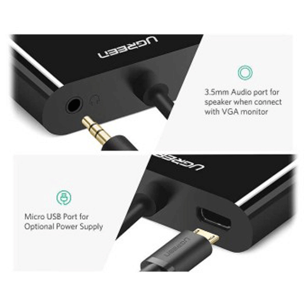 نسخه HDMI مورد پشتیبانی توسط این تبدیل 1.4 میباشد و میتواند تصاویری با کیفیت Full HD را به خوبی به نمایش بگذارد. برای استفاده از پورتهای خروجی میتوان یکی از آنها را برای انتقال تصویر استفاده نمود. پورت VGA تنها میتواند سیگنالهای صدا را منتقل کند. از طریق پورت HDMI میتوان هم صدا و هم تصویر خروجی را در اختیار داشت. همچنین یک عدد جک 3.5 میلیمتری برای خروجی صدا در نظر گرفته شده است.یک عدد پورت Micro USB به منظور تامین برق مورد نیاز برای تبدیل Micro HDMI به HDMI و VGA یوگرین Ugreen MM115 تعبیه شده است.