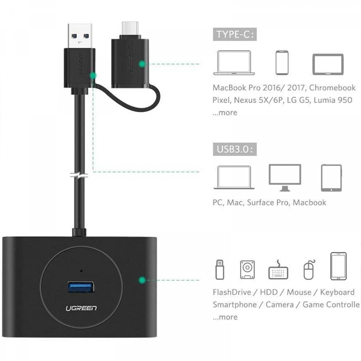 هاب چهار پورت USB 3.0 یوگرین مدل 40850-CR113 محصولی باکیفیت از برند یوگرین است که دقیقاً برای پاسخ به این نیاز شما طراحی شده است. یک سر این هاب رابط USB 3.0 قرار گرفته و بر روی بدنه آن چهار درگاه USB 3.0 قرار دارد. سرعت انتقال اطلاعات بر روی این هاب، 600 مگابایت بر ثانیه است و اطلاعات شما را با سرعت بالایی انتقال میدهد. از جمله ویژگیهای این هاب میتوان به وجود یک تبدیل USB 3.0 به Type-c از نوع OTG اشاره کرد که به کمک آن میتوانید این هاب را به دستگاههای دارای Type-c متصل کنید. فهرستی از این دستگاهها در زیر آمده است. همچنین طول یک متری کابل این دستگاه کمک میکند از آن در محیطهای مختلف به سادگی استفاده کنید.