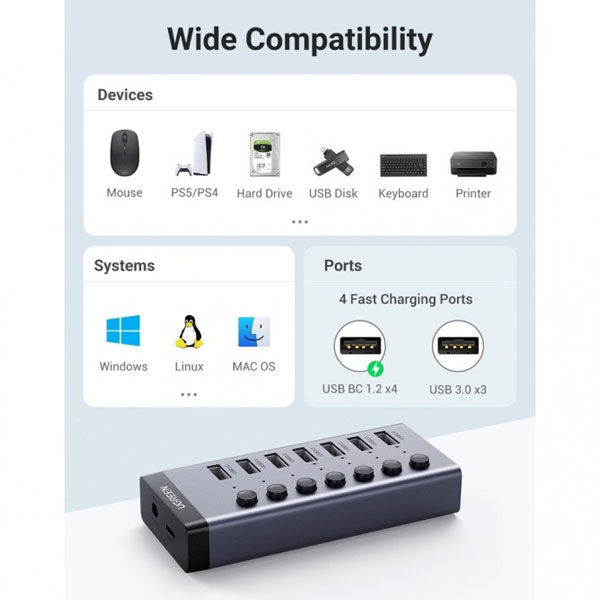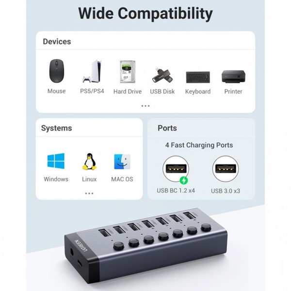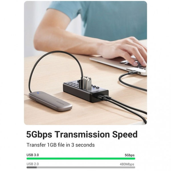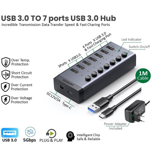 هاب «CM481-30778» محصولی از برند «یوگرین» (UGREEN) است . این هاب USB بدنهای پلاستیکی فشرده مشکی دارد . در این هاب USB تعداد 7 عدد پورت USB 3.0 وجود دارد که میتوانید با استفاده از دو درگاه ورودی آن برق موردنیاز برای این درگاهها را تأمین کنید . با استفاده از هاب CM481-30778 یوگرین میتوانید بر محدودیت پورتهای USB 3.0 غلبه کنید و از یک پورت به 7 پورت USB 3.0 برسید . استفاده از آداپتور جداگانه ، عملکرد بی نقص هاب و امنیت دستگاههای شما را تضمین میکند . برای اتصال هاب به کامپیوتر ، یک کابل 100 سانتیمتری متصل به هاب CM481-30778 دارد و طول بسیار خوبی برای اتصال به کامپیوتر دارد. این محصول شرکت یوگرین دارای آداپتور می باشد.