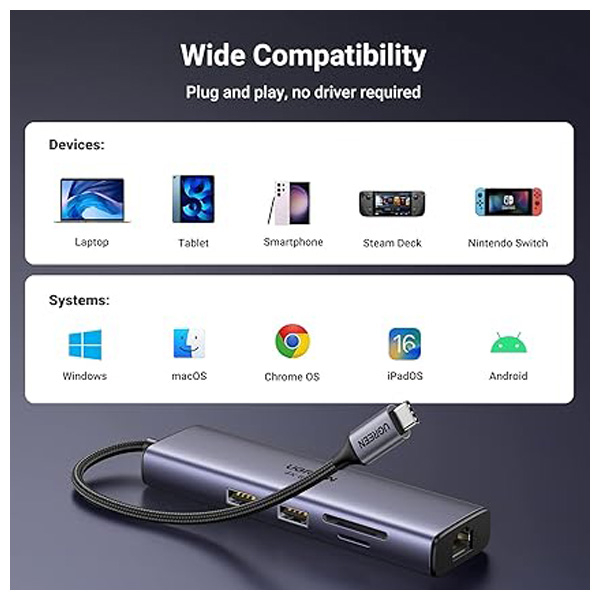 هاب 7 پورت USB-C یوگرین مدل CM512-60515، از 2 پورت USB-A ورژن USB3.0، یک پورت انتقال برق USB-C PD3.0 1000W، یک درگاه HDMI 4K@60Hz، یک درگاه RJ45 1000Mbps، یک درگاه SD card با سرعت 104MB/s و یک درگاه TF card با سرعت بالا پشتیبانی میکند، که این امکان را به کاربر می دهد به راحتی بتواند ابزارهای جانبی مختلفی مانند کیبورد ، ماوس ، دوربین، پرینتر، پاور بانک و … خورد را متصل کند.