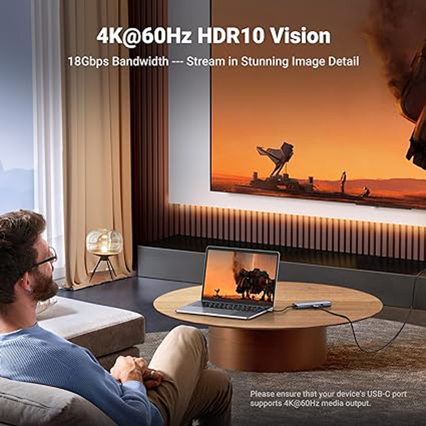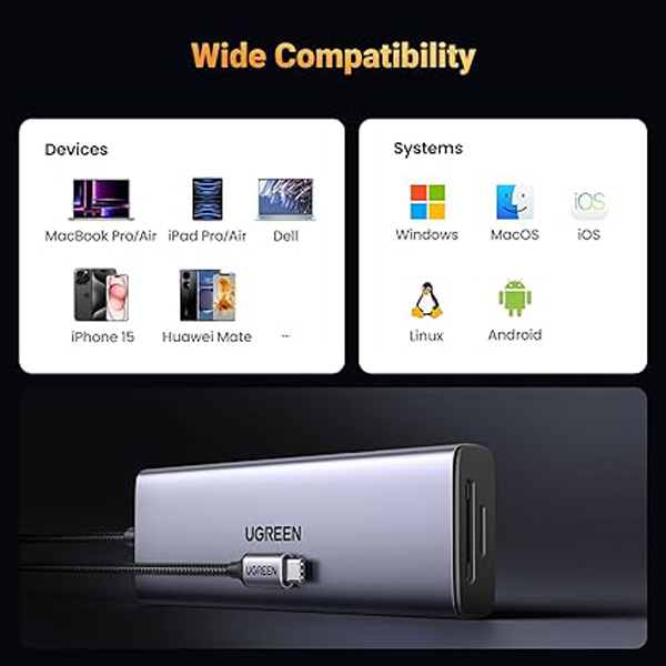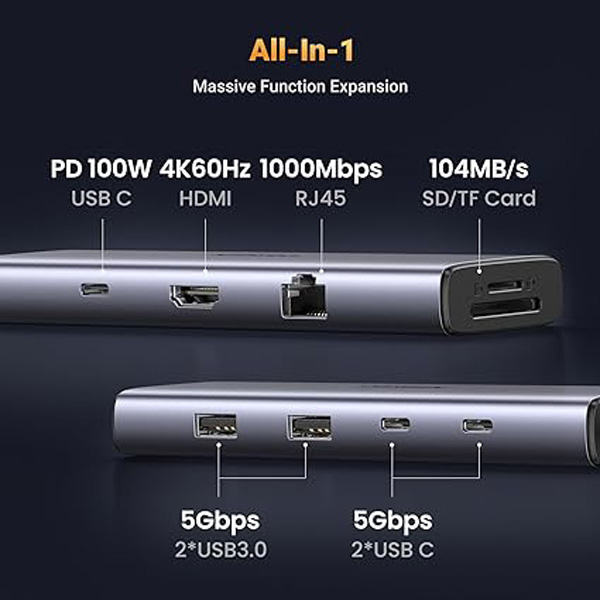 هاب 9 پورت USB-C یوگرین مدل CM498-15375 از 2 پورت USB-A ورژن USB3.0 و 2 پورت USB-C دارای سرعت انتقال تا 5Gbps، یک پورت USB-C PD3.0 1000W، یک درگاه HDMI 4K@60Hz، یک درگاه RJ45 1000Mbps، یک درگاه SD card با سرعت 104MB/s و یک درگاه TF card با سرعت بالا پشتیبانی میکند، که این امکان را به کاربر می دهد به راحتی بتواند ابزارهای جانبی مختلفی مانند کیبورد ، ماوس ، دوربین، پرینتر، پاور بانک و … خورد را متصل کند.